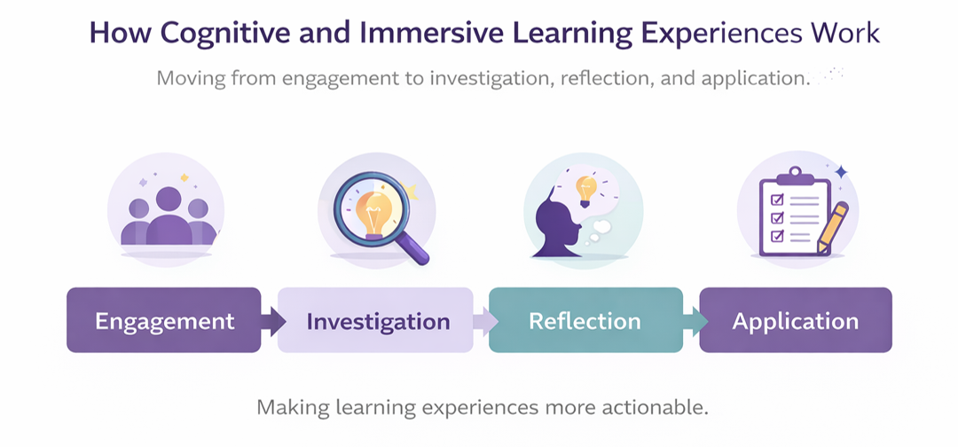 Cognitive and immersive learning experiences are designed to help participants do more than receive information. They are structured to increase attention, deepen processing, support reflection, and encourage the transfer of ideas into practice.