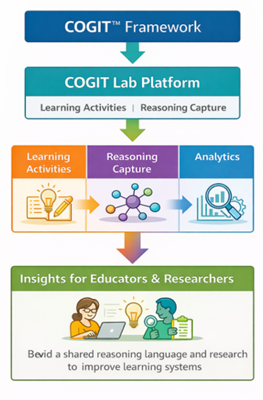 The COGIT Lab platform extends the COGIT™ Framework by supporting learning activities, capturing patterns in student reasoning, and generating analytics that help educators and researchers better understand cognitive development and instructional impact.