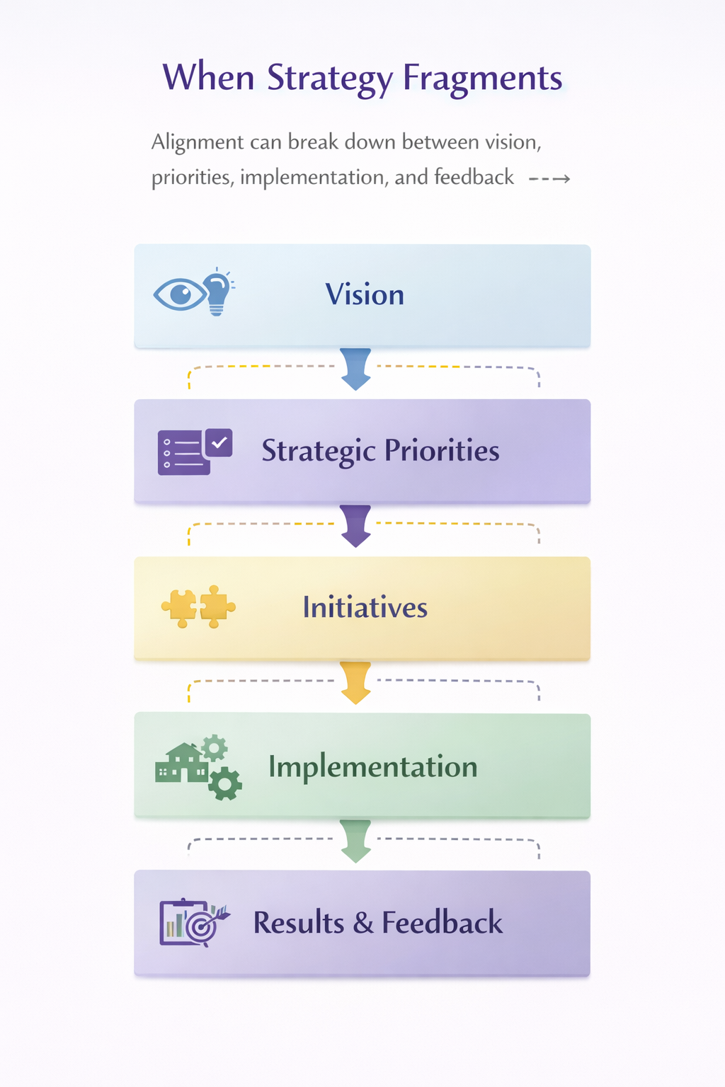 Strong strategic plans can lose power when alignment breaks down between vision, priorities, implementation, and feedback.